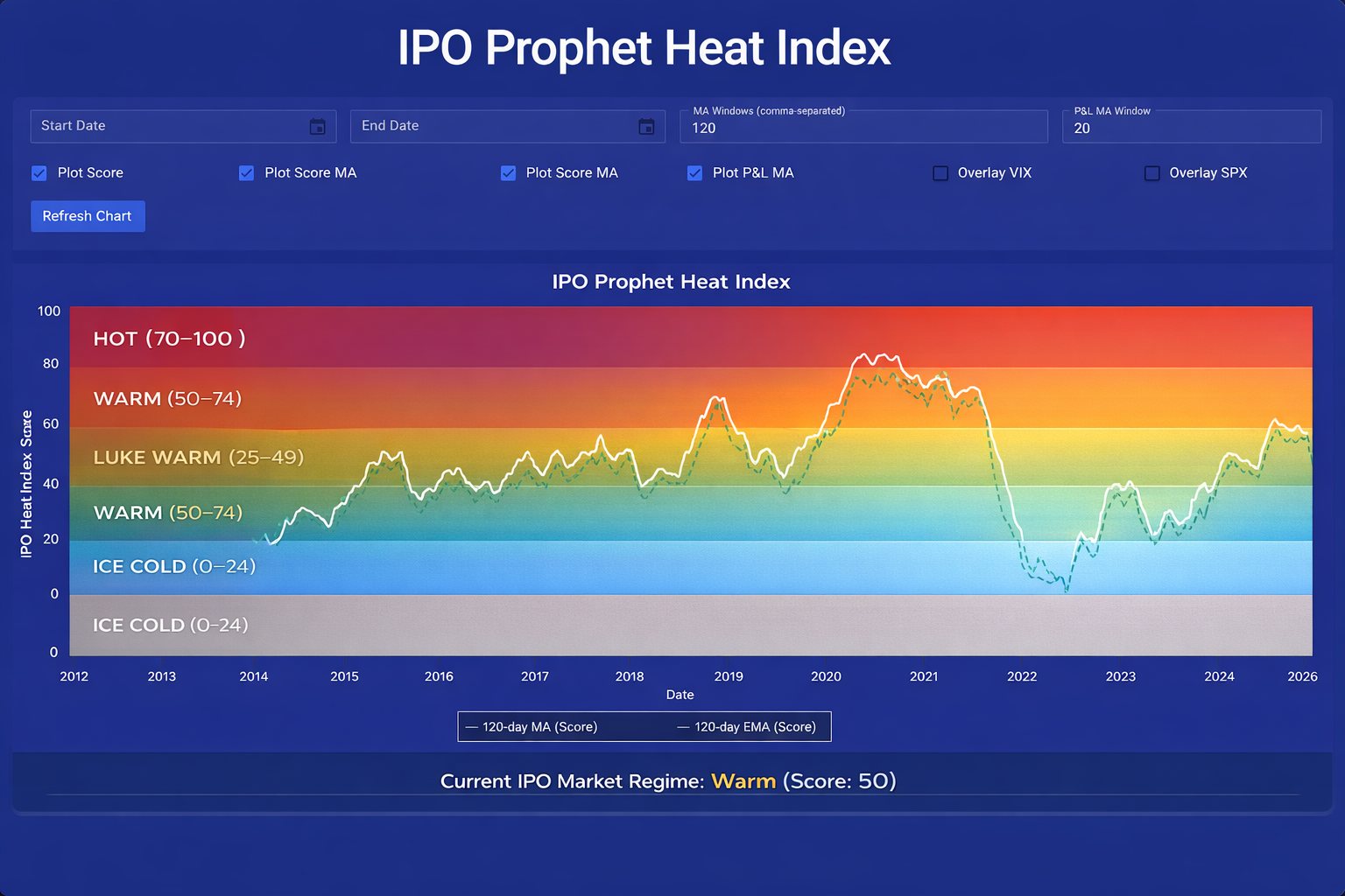 The IPO Prophet® Heat Index is a proprietary measure of the current state of the IPO Market in real-time— Regimes include: Ice Cold, Luke Warm, Warm, and Hot. The IPO market changes quickly and this quick glance keeps you up-to-date. This is the lead indicator on the current state of the IPO ecosystem.